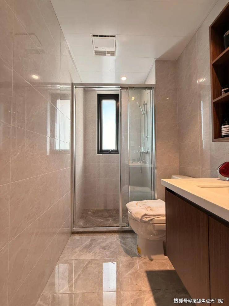 卫生间离连廊较远,私密性好,且开门不正对卧室门,另带飘窗。增加了实用性;