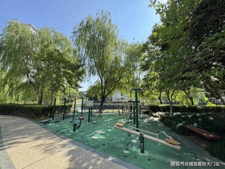 因为小区临河而建,西南侧的楼盘全都是水景房,小区内也配置了沿河步道,活动区就在步道旁,边欣赏河景边健身,确实惬意。