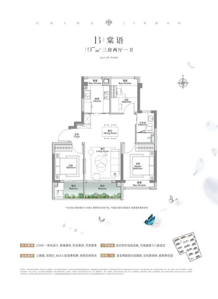 建 面约97㎡3房2厅1卫,户型三 开间朝南、 再加上“3 个飘窗+双面阳台系统” ,不管是采光、视野、通风、私密性,还是实用性都十分出色。