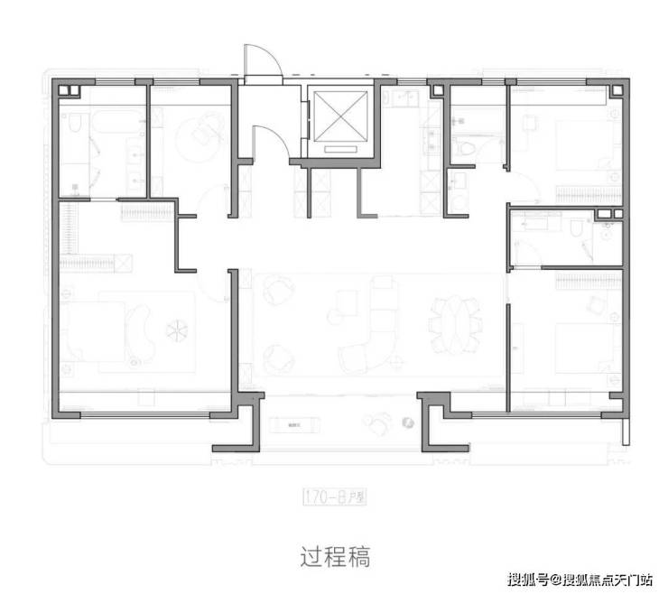 建面约170㎡B户型,五面宽,南向总面宽约17.2米,餐客厅面宽约8.2米。主卧面宽约5.4米,独立衣帽间,设计三套房,收纳做足。