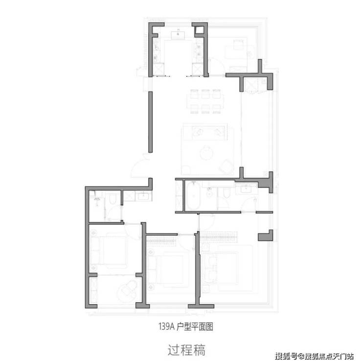 建面约150㎡户型,四面宽,南向总面宽约14.2米,客厅面宽约4.3米,进深约7米,客餐厨阳台一体化,主卧面宽约3.8米。三阳台(交付后不破坏外立面可以自行打通改造)、主卧大转角飘。
