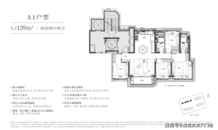 4#楼户型为建面约139㎡四房,拥有“个性大四房+15.05米IMAX大面宽+一梯一户(边套)+270°转角飘窗”构建纯粹改善设计。