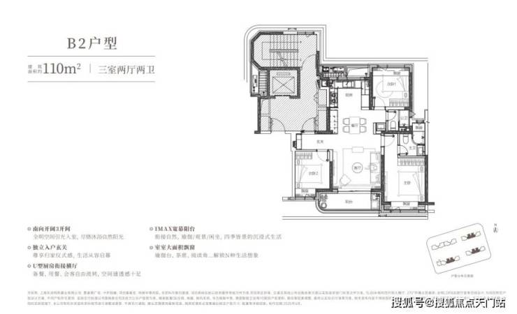 建面约110㎡中间套(B2户型),也同样做到了南北通透,三开间朝南,洄游动线,布局合理,无论是空间尺度还是通风采光,与边套享受一样的品质感!