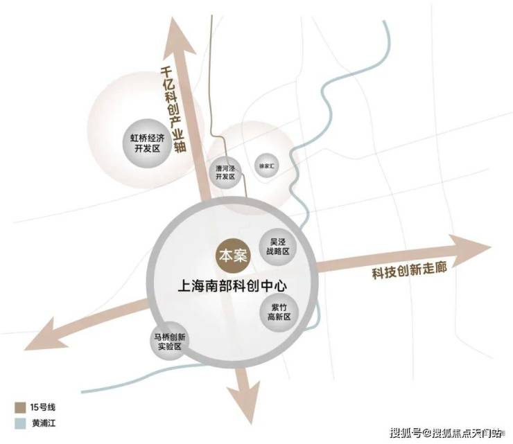 上海发展大势向南, 元江作为上海南部科创中心核心区,向北呼应 大虹桥国际商贸带,向南接引 “大零号湾”,东联吴泾 “滨江战略留白区”,西接 马桥人工智能区的生活秀带,定鼎闵行主城科创重策地;