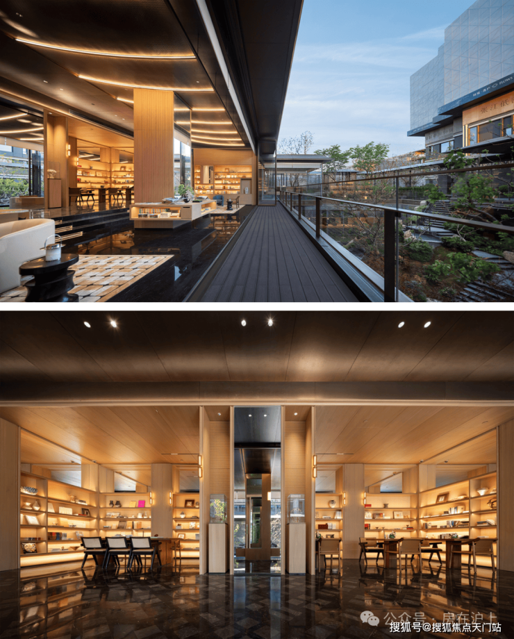 "悬亭茶室"占据社区最佳观景位,可俯瞰整个下沉庭院。这个悬浮式空间,既是品茶洽谈的场所,本身也成为社区一道亮丽景观。