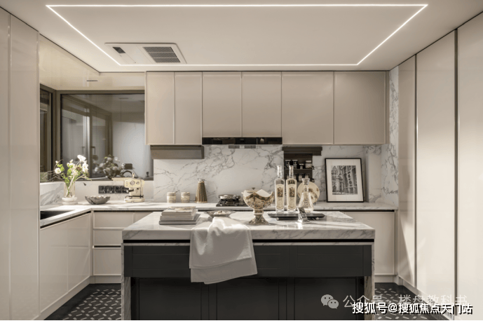 超大尺度的中西岛台 ,既符合中式烹饪的实用逻辑(预留足够操作台面),又能承载西式社交(朋友小聚时在岛台品酒聊天),让厨房从“单一做饭空间”变成“生活场景发生器”。