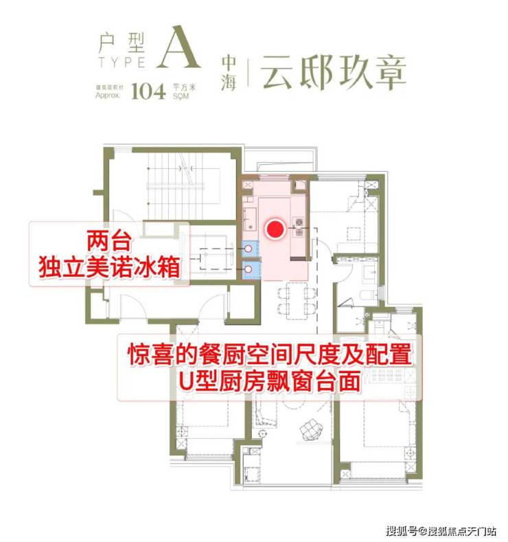在餐厨空间的细节上项目把控到位,利用厨房飘窗打造了台面,形成利用率更高的U字型设计,并且预留了2个冰箱点位,预计配置2台独立美诺冰箱。1台可以储存新鲜蔬果肉蛋,另1台可以储存奶酒饮料零食,分类更明确,容量更大胆!
