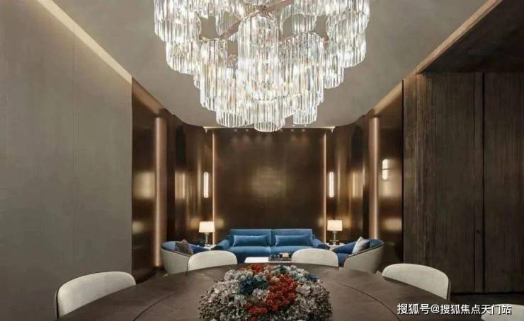 私人宴会厅的配色运用了深浅对比的原则,墙面通过立体层次的塑造呈现出雕塑般的体量感。宝蓝色的餐椅为空间注入了一抹象征梦想的亮色,上方垂落的华丽吊灯奠定了奢华的基调,而温润的木质元素则自然平衡了整体氛围。