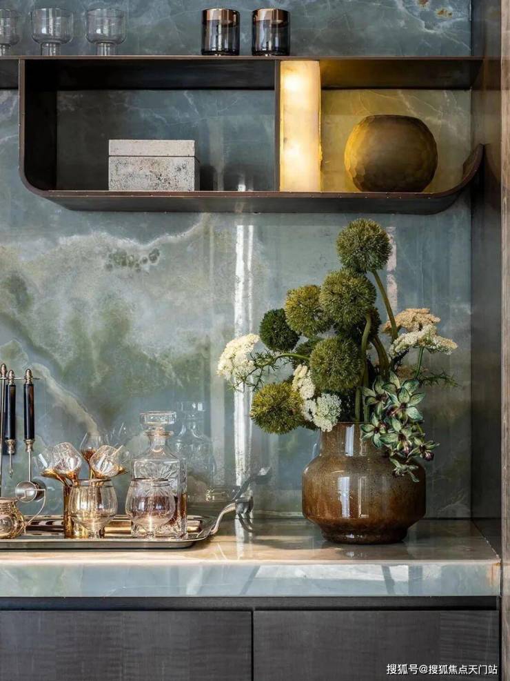 地下一层空间展现出独特的融合美学。古典海派的韵味与现代艺术的简洁在此交汇,从当代的优雅线条到历久弥深的内敛气质,设计通过风格与细节的持续对话营造张力。几何形态的肌理、材质本身的天然花纹、以及具有雕塑感的装饰品,共同叠加出丰富而深厚的生活层次。