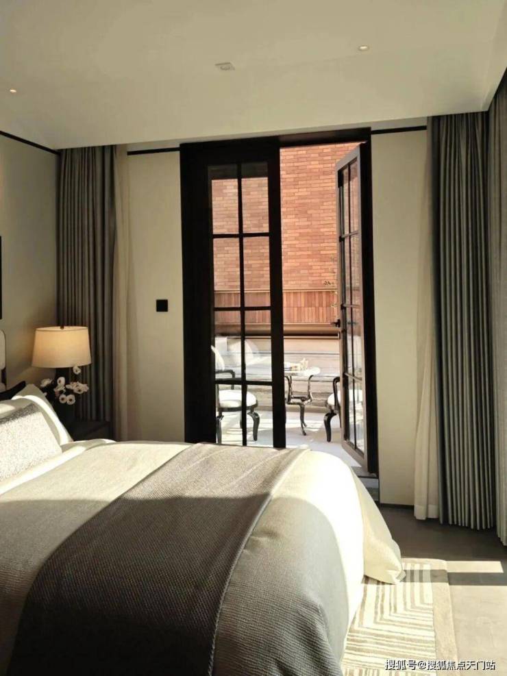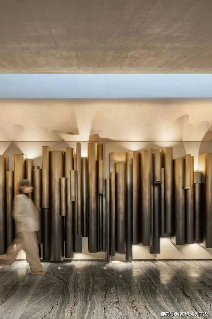 步入一层大堂,全景玻璃门将光线与景致最大限度地纳入室内。光影随着时间流转,自然引导着人的行进路线。门外侧包裹的古铜材质,不仅增添了建筑的奢华质感,其本身带有岁月痕迹的肌理,也成为连接过去与当下的视觉符号。