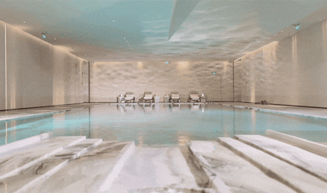 会所的游泳池营造出全然惬意的体验。墙面与天花板的材质搭配,将水面反射的粼粼波光不断扩散,形成置身水底的沉浸感。顶部天窗引入自然光线,随着云影流动,为空间注入一份无拘的自在。