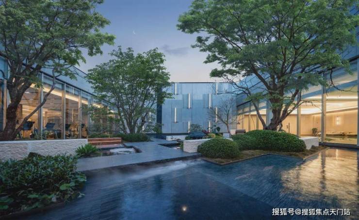 而人行线路则由星级酒店式的入户大堂进入,接着便是6S会所环绕的下沉式水景庭院,7米高磅礴大气的跌水景墙配合三棵参天乌桕林和原石、浮桥交错的地面水景,若是傍晚归家,还能欣赏倒映在水中的点点星光,可谓满满的奢雅意境和尊贵仪式感!