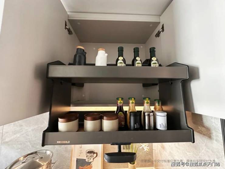 采用 顶天立地高柜设计 ,嵌入电器的同时,通过透明密封罐统一收纳干货杂粮并贴标存放于拉篮内,容量充足可叠放约8个山姆款家庭装零食大礼包;并将备餐区下方的抽屉升级, 配置碗碟拉篮、分区调味拉篮 ,实现 “一拉到位、一目了然”,可满足6-8人份碗筷收纳需求,吊柜搭配升降拉篮解决高处取物难题。