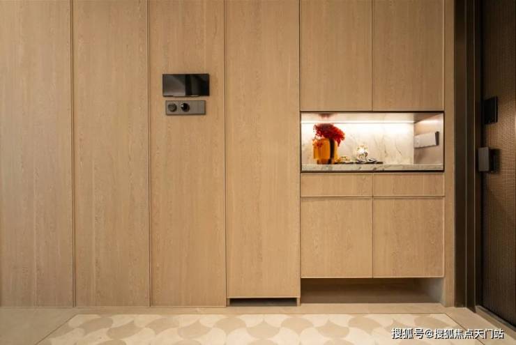 值得一提的是,整个玄关柜是 天然木皮鸡翅木包裹 ,用料昂贵。并且与墙面、地板几乎一个色系,营造一气呵成的视觉观感,传递出一种低调内敛的豪华感。