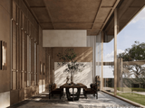 厅堂和轩堂,也在这番赏景过程中,毫不突兀地依次出现。前者还原出孔子树下讲学的场景,后者则用金属编织的卷帘搭配青绿色彩釉玻璃,构建出一个品茗厅琴的空间。这一切来得如此自然、连贯,富有节奏和层次,把园林艺术的本质抓得入木三分。