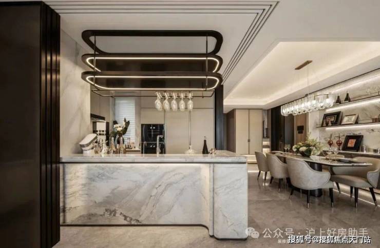 室内大量运用奢石,搭配统一木饰面与皮革材质,通过圆弧设计、隐形出风口、无高差客厨地面等“隐形美学”处理,让奢华与舒适完美融合。