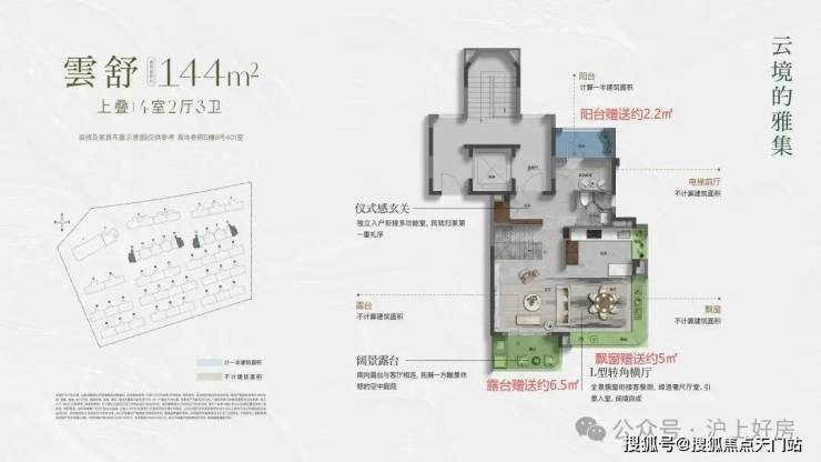 建面约144㎡的上叠产品,通过巧妙的 、 总计 15㎡露台灵动空间 设计,让户型的 实际可使用面积高达约180 ㎡,实得率约125%。