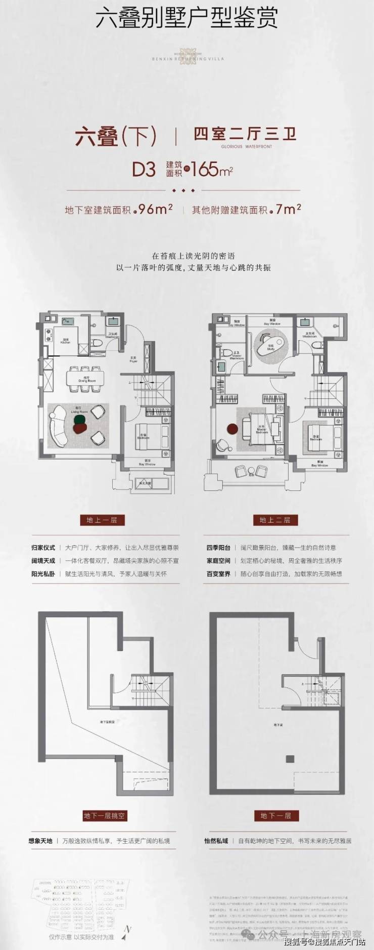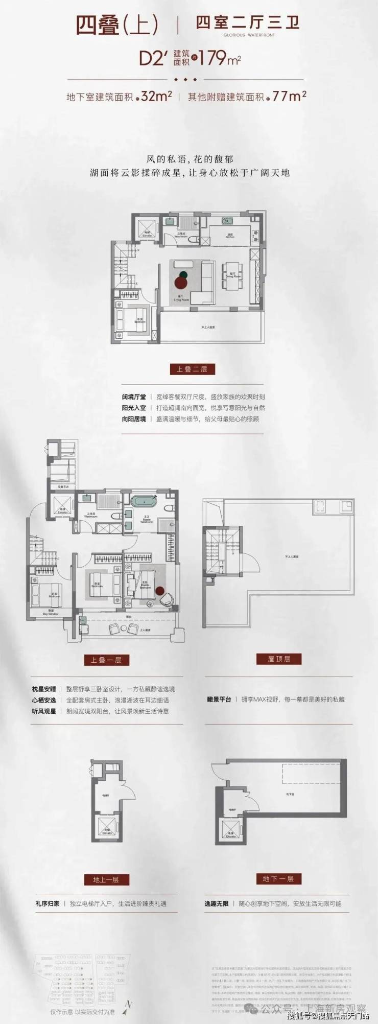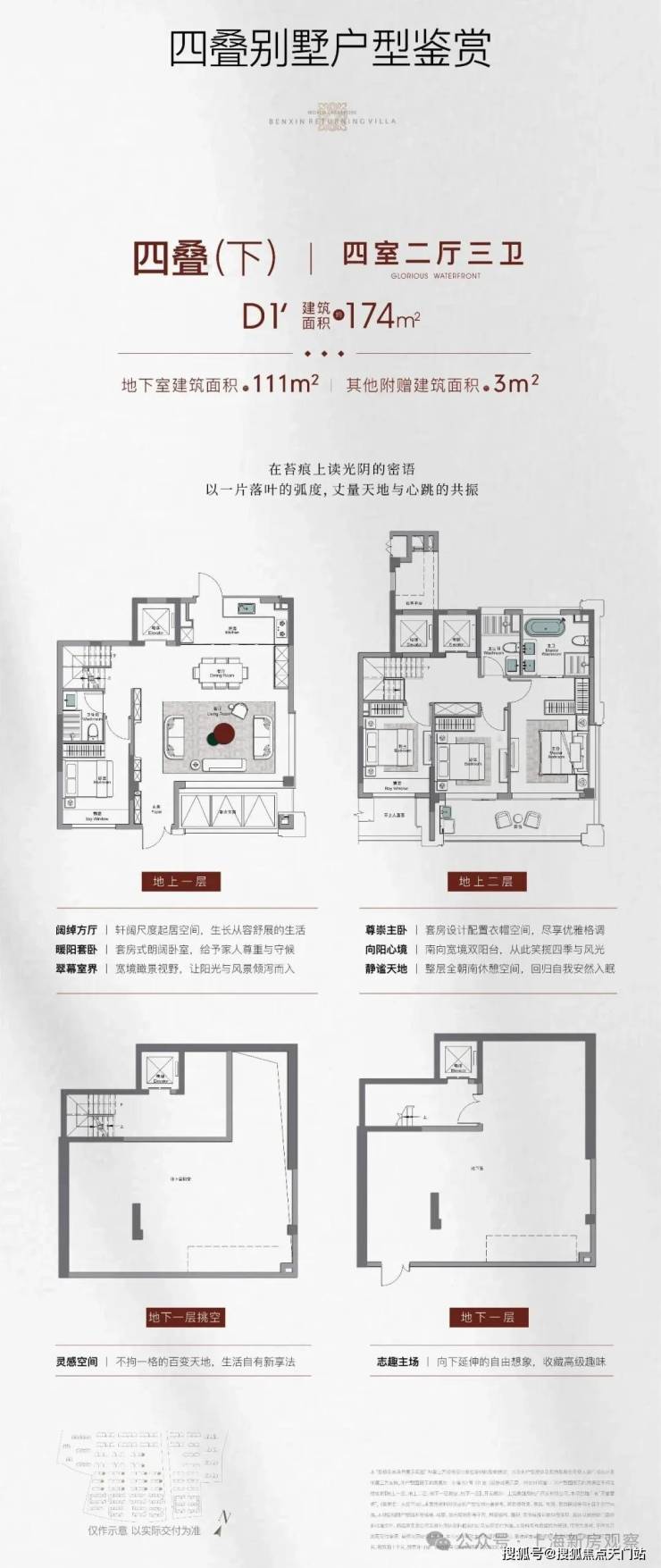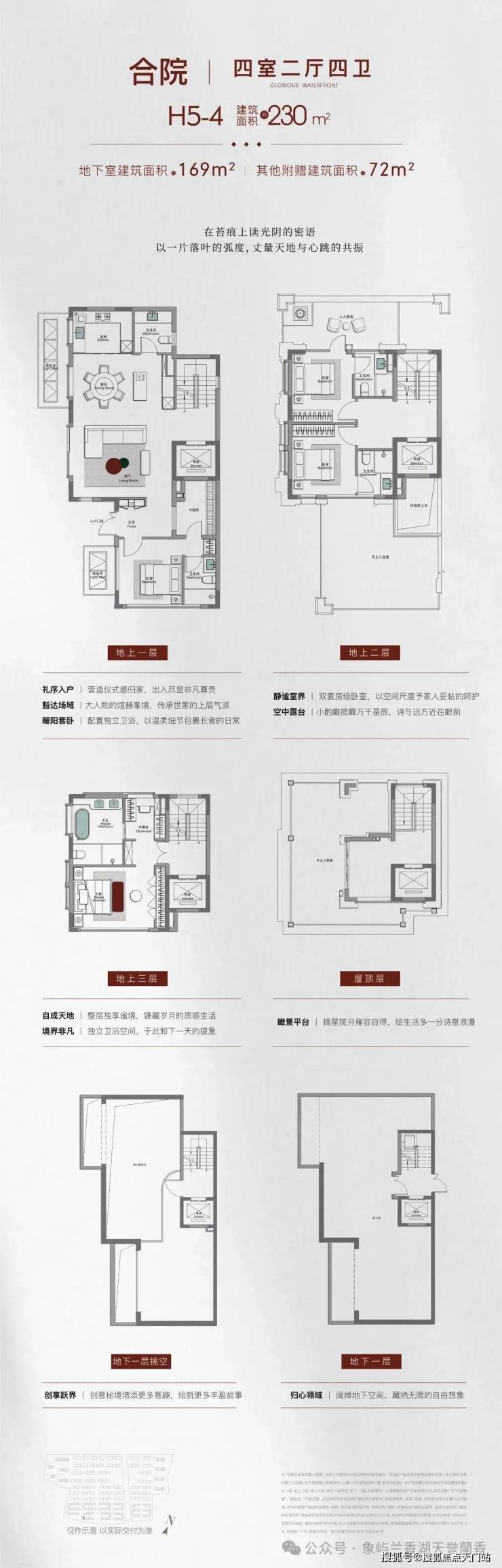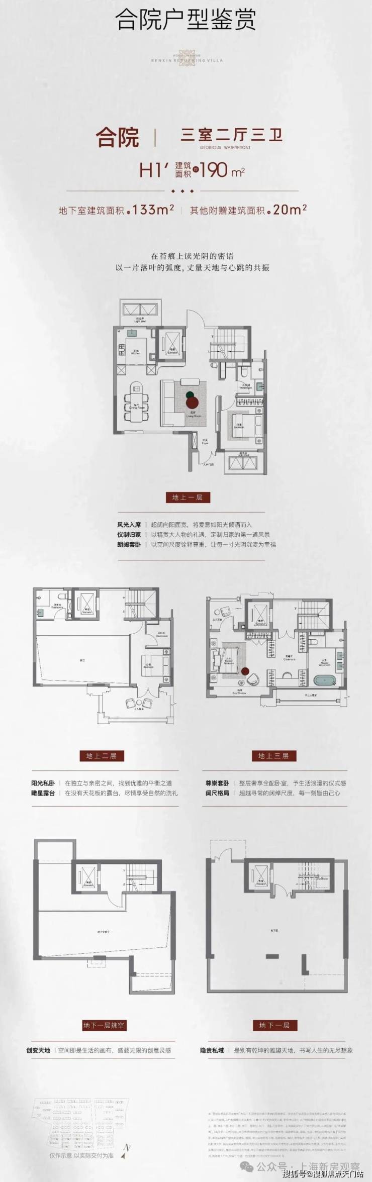合院:建面约190㎡三室两厅三卫、约210-230㎡四室两厅三卫/四卫,附赠地下室+露台,总价预计约2000万;3层地上+地下室设计。