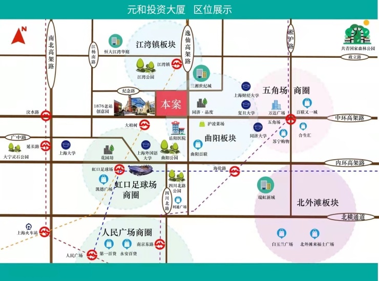 元和投资大厦位于上海市虹口区逸仙路靠近纪念路,坐落中环交通动脉线,逸仙路高架场中路下匝道、轻轨明珠线江湾镇站全线畅通。在城市商业副中心五角场大柏树商圈,雄踞五大商圈聚焦之地大柏树商圈,紧拥中环线。周边小区环绕、板块成熟、配套齐全、环境优美。