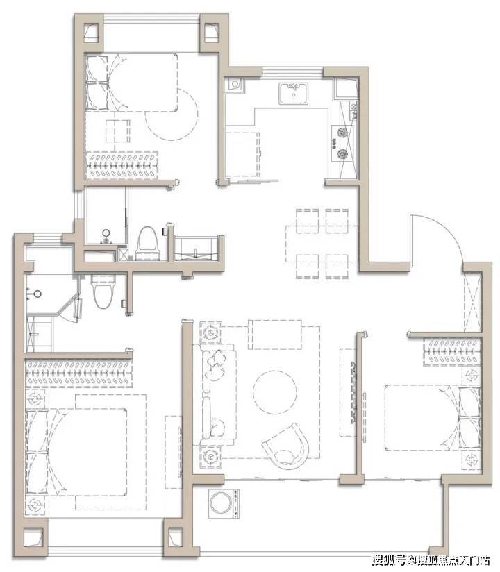 全屋没有过道的浪费+卧室飘窗设计,高效利用每一寸空间,也更加延展了空间感。这个户型兼顾了实用性和功能性,也很好地控制住了总价,很适合年轻家庭上车。