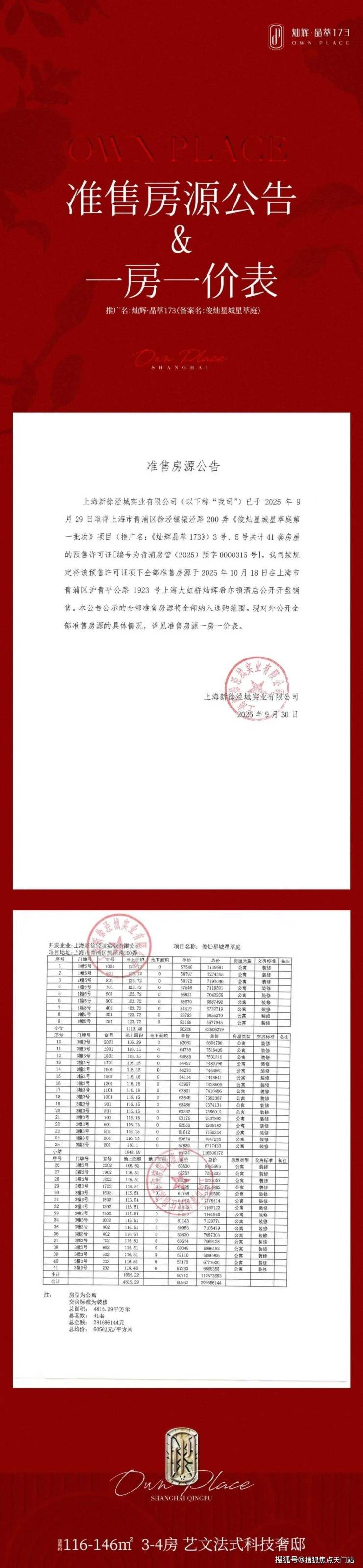 最新消息,一房一价表发布!大虹桥徐泾「灿辉晶萃173」!推出建面约106-124㎡三房,均价6.05万/㎡!
