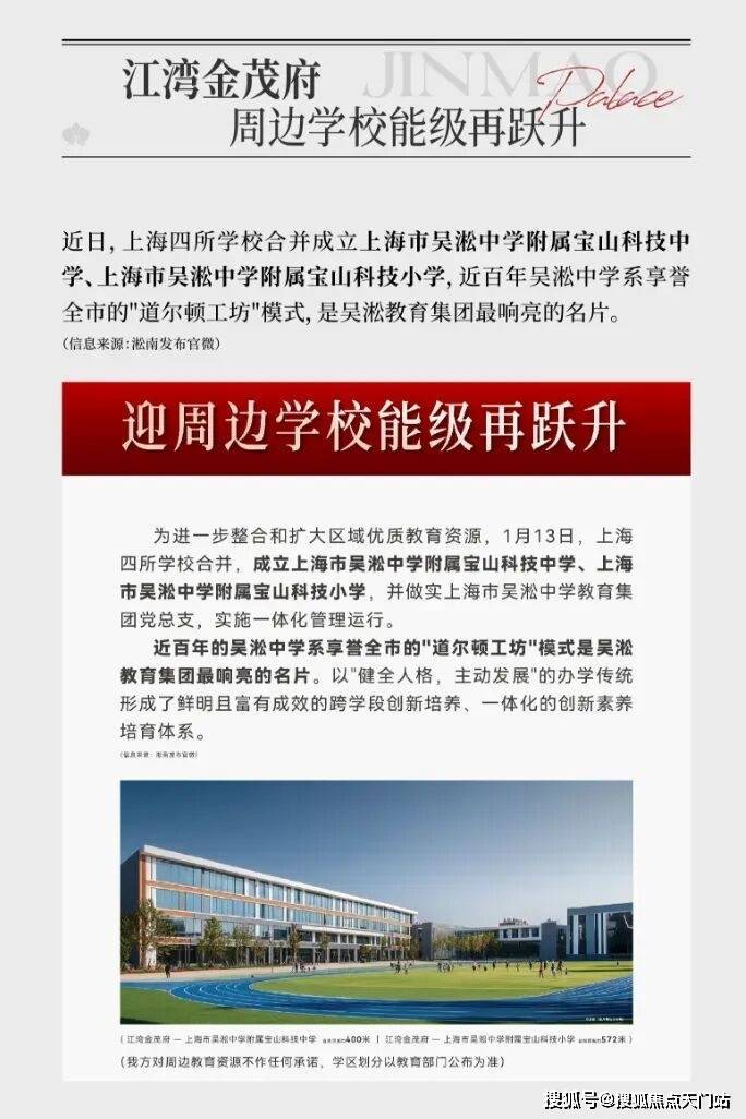当板块内的教育资源通过战略合并与整合实现能级跃升,其带来的不仅是教育选择的优化,更是区域价值的深层加固。优质学校的聚集,始终是资产穿越周期最坚实的保障,为社区提供着持续而稳定的内生动力。上海四所学校合并成上海市吴淞中学附属宝山科技中学、上海市吴淞中学附属宝山科技小学两所重点学校,这将为江湾金茂府的未来价值提供重要支撑。