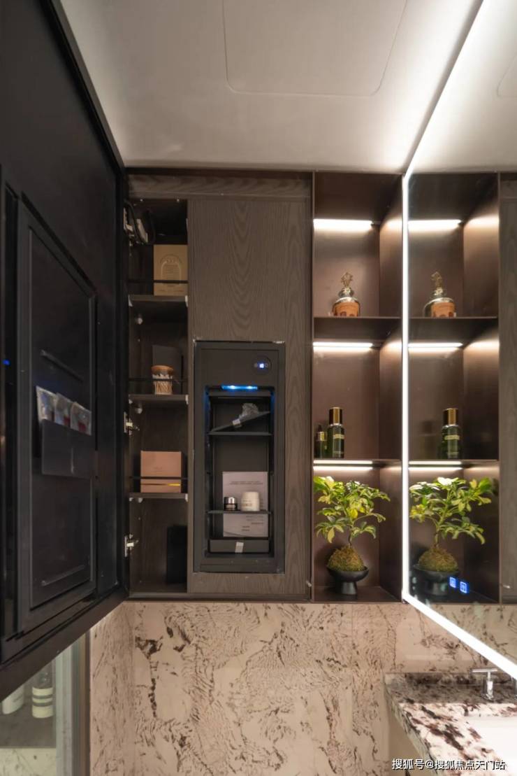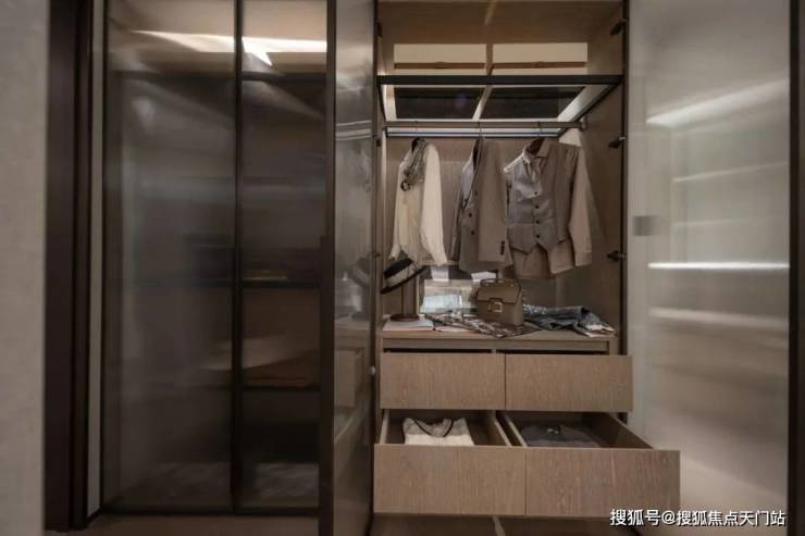 小户型最让人担心的小户型的收纳问题招商序给出了自己的解题思路,让我们看看它的收纳空间,首先是一整排的玄关收纳,玄关柜据说可以放下28双高筒靴,而且是大理石的台面石,另一侧的储物柜是一个容量较大的落地柜,足够收纳一个大行李箱,背面还贴心设置了洞洞板,可以悬挂雨伞、包包等物品,整个玄关柜是天然木皮鸡翅木包裹,非常高级,预留S墙的设计轻松收置双开门冰箱、厨房与卫生间采用了模块化的收纳系统,通过碗碟拉篮、谷物抽、不锈钢开架,贯穿式镜柜与美妆冰箱等收纳道具,将日常用品归置的仅仅有条,114主卧更是预留了超大的衣柜空间。