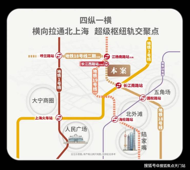 1、 板块价值 : 项目占位淞南板块 , 作为中环沿线 10年断 供 的板块 , 地理位置优越 , 背靠杨浦、咫尺江湾 , 不仅承接 了 五角场、北外滩的外溢红利, 更以 18 号线长江西路站 (在建中 ,距离项目直线距离仅约 200米 )构建「 主城生活圈」,这种「 板块优势 + 地铁 TOD」的地段配置 ,在市场波动中始终是资产安全垫 ;