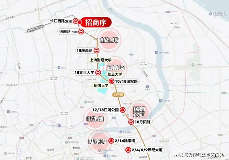 从长江西路出发(在建)出发,2站就是新江湾,4站财大,5站复旦,6站五角场,8站新华医院,11站杨浦滨江,12站陆家嘴滨江...