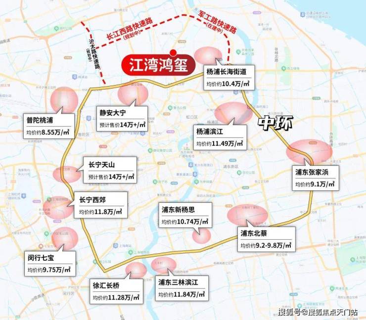 再来看中环沿线新房价格当前的格局。规划强势的如徐汇长桥,三林滨江,静安大宁,杨浦滨江等,价格全面突破11万+/㎡。