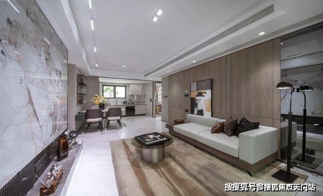 客厅背景墙岩板,客厅采用金属踢脚线,提升整体质感;