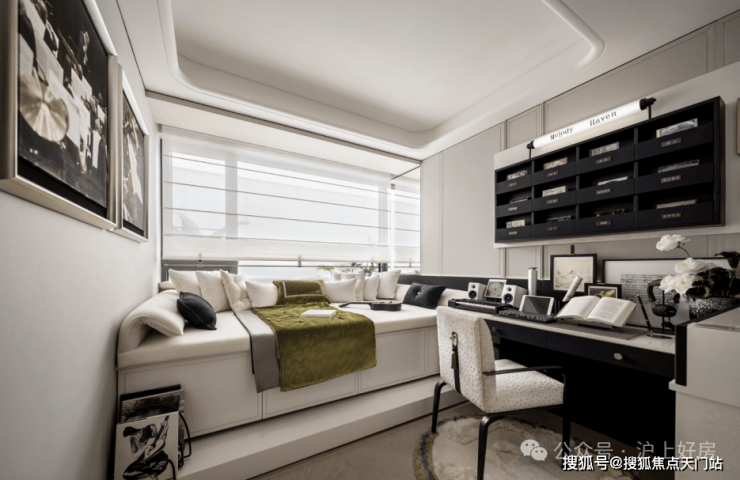南向卧室的设计更是点睛之笔,通过可开可合的移门,与客厅上演空间魔法,实现卧室、开放式书房、客厅延伸区的三重空间形态。