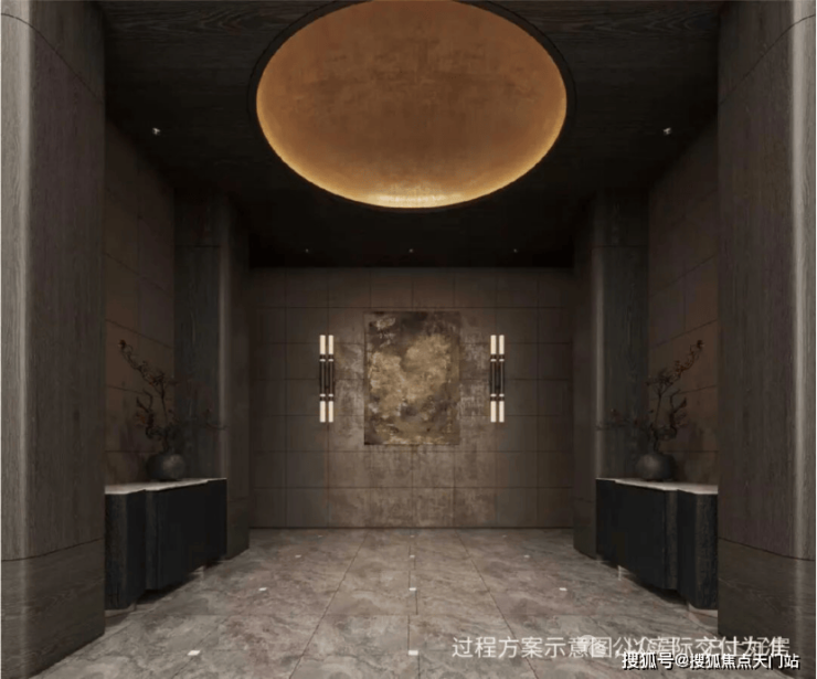 约50m面宽的气派门头+酒店式入户大堂: 打造艺术格调归家。入户大堂由吴滨设计,呈现“天圆地方”的效果,方正的线条勾勒出空间的规整与大气,与顶部的圆形形成刚柔并济的视觉平衡,让每一次归家都成为一场尊贵的礼遇。