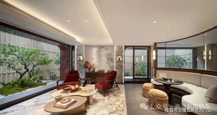 庭院中央采用巴西进口亚马逊绿奢石打造的流水景台,单价高达约4000元/㎡,配合灵感源自复兴公园紫藤廊架的景墙,潺潺水声与静谧光影,共同凝筑成一个静谧诗意的角落(项目红线外不作为交付承诺)