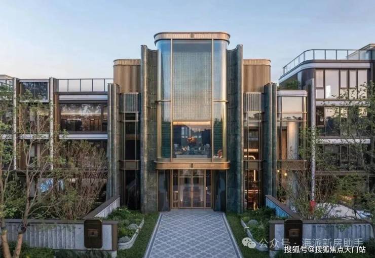 萃屿原墅立面采用大面积玻璃、金属线条、威斯康白石材,将松江新城的住宅建筑美学拉入下一个LEVE,尤其是香槟色金属线条如剪裁合体的高级西装骨架,勾勒出建筑的精致轮廓