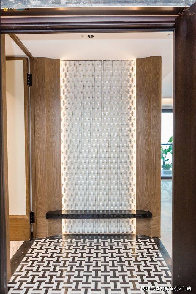 样板间进门后,映入眼帘的是 陶瓷的编织纹玄关背景墙 ,极具质感和尊贵感。