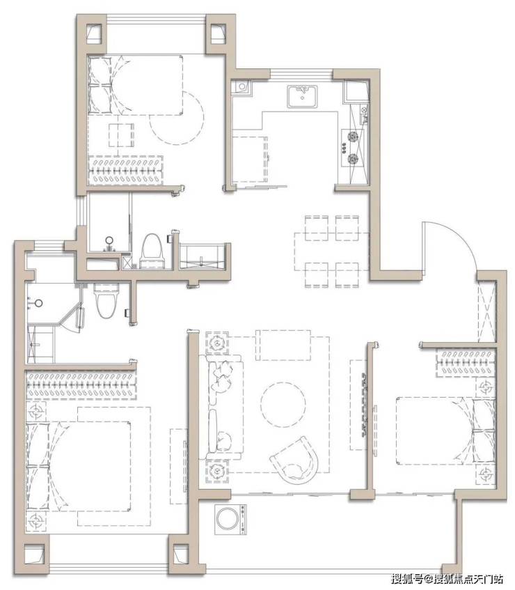 细节方面,入户玄关+主卧套房+客卫干湿分离,这个户型几乎做到了一个好户型应该有的所有。