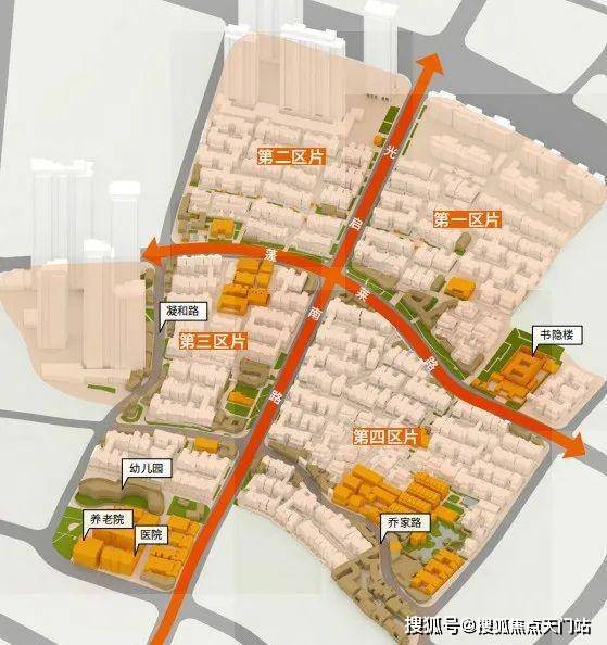 第三片区:以蓬莱路市场、凝和路商业街以及幼儿园、养老院、医院为公共服务配套的居住组团