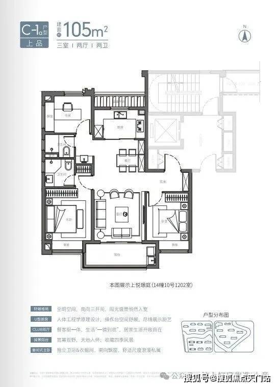 U型厨房、餐厅、客厅、阳台一线联通,南北通透。主卧套房、全卧飘窗、次卫干湿分离也都是标配。