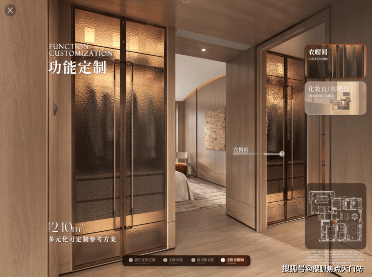 就以240㎡户型的主卧衣帽间来看,项目为业主提供了整体收纳、嵌入化妆台、mini bar等多种方案。
