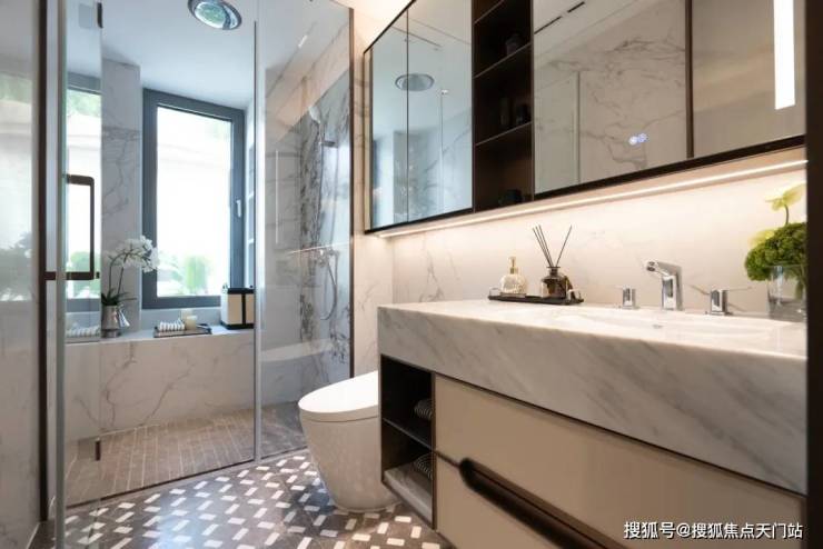 细节偏执:全屋大量使用到奢石,归家门厅墙面采用石材镶嵌意大利毕加索奢石,地面采用大理石水刀海派拼花等,更显高端审美和品味。