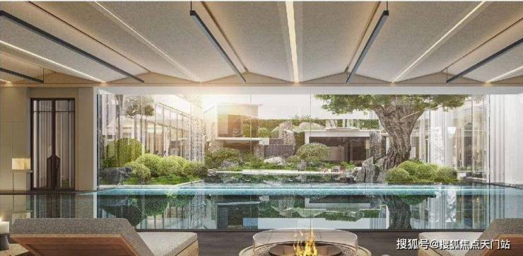 浮光池院水院会客厅,现已实景呈现,水景中央的艺术小品,如一滴水在湖面晕开,泛起阵阵涟漪。