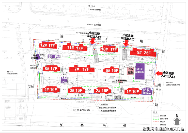 其中1号楼靠近17层的保障房,5号口为3层的配套用房;14#、15#为P站,16#为垃圾用房。