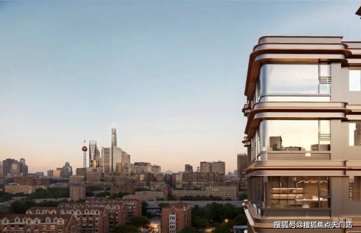 小高层外立面采用了弧形天幕设计, 大面积玻璃天幕立面辅以香槟金铝板条 ,搭配超高的窗墙比,不仅重塑了周边的城市天际线,更是可以对望陆家嘴天际线,豪宅范十足!