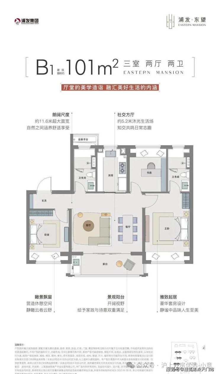 建面约101㎡B1户型尺度感惊人,约5.2米南向面宽的客餐厅以及阳台,为室内带来了非常出色的采光度。
