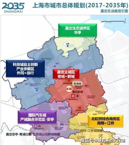 嘉定规划形成“一核四区”功能布局:嘉定主城区是核心,四区是指虹桥综合商务区(也就是南翔和江桥)、科技城自主创新产业承载区(徐行和外冈)、安亭国际汽车城产城融合示范区、华亭嘉北生态涵养区。
