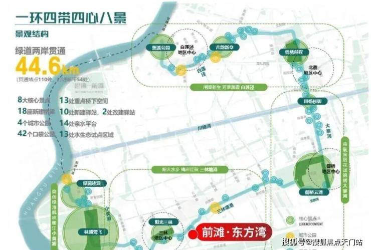 周边前滩友城公园、前滩体育公园、东明公园等已建成公园,三林塘港、“林浦莺飞”、“绿茵逐浪”等核心景点将连缀成片,形成气势磅礴的滨水公园带。
