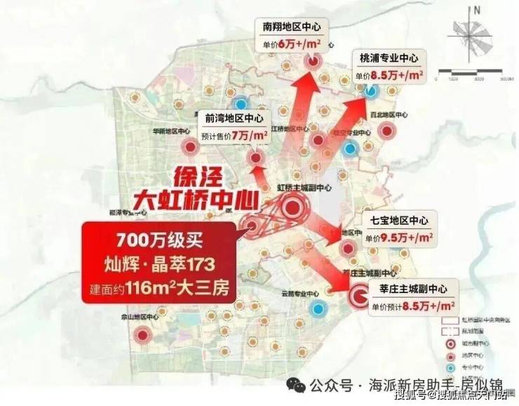据销售人员透露,灿辉·晶萃173的总价在700-1000万左右,116㎡改善大三房总价700万级。而同样700万,只能买七宝、莘庄、桃浦等板块的90㎡紧凑户型,或者买南翔、华漕的100㎡户型。这些板块比起徐泾如何?