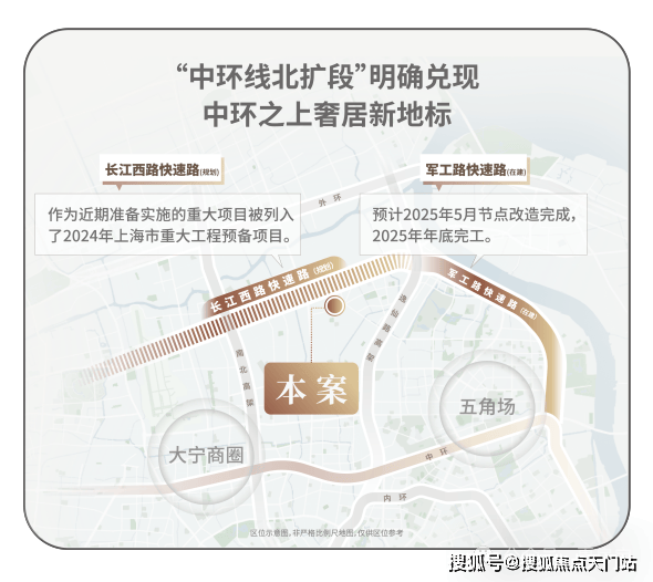中环线北扩段明确兑现,军工路快速路25年开工,长江西路快速路列入上海市重大工程清单预备项目,快速链通城心, 随着中环线北扩段的政策明确,淞南将正式进入中环时间。未来经逸仙高架,进入南北高架、内环高架、中环高架,可快速链通南北上海;多维立体路网全面升级,未来区域价值再攀新高。