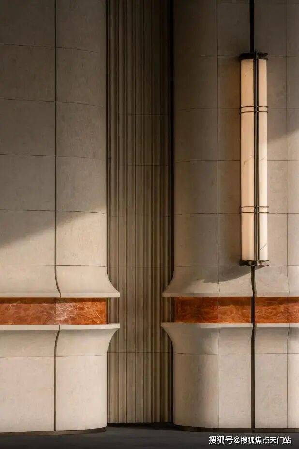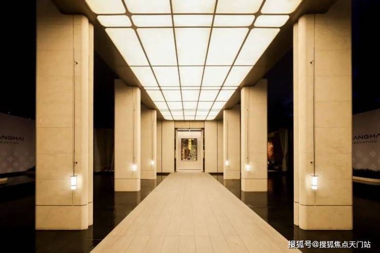 此外,招商序还藉由“吴淞灯塔”及其形制,原创落客雕塑“源流”,定制的云石玻璃、保加利亚进口的沉香米黄石材的底座,搭配以安哥拉黑大理石,营造温润的归家昭示。整个前庭形成艺术感与实用性兼具的环岛式落客区,进一步提升仪式感。